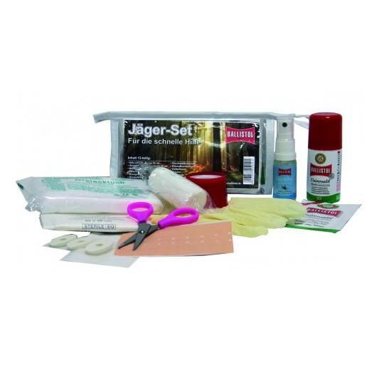 Ballistol spray 25ml, stikkfri myggmiddel 10ml, Ballistol våtserviett, sårstrips, kompress, fatle, gnagsårbeskytter, engangshansker, sportstape, saks, gasbind, og plaster.
