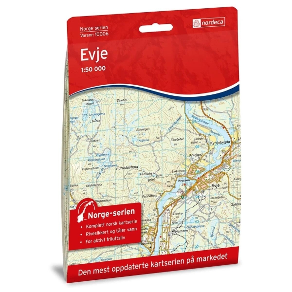 Norge-serie kartet Evje i målestokk 1:50 000 er trykket på et slitesterkt resirkulerbart plastfibermaterial som tåler vann. Kartet egner seg for turgåere, jegere, fiskere og brukes blant annet av redningskorpsene. Norge-serien er en landsdekkende kartserie og er derfor også populær for de som går lengre turer. Overlapp på alle kart gjør det enkelt å navigere mellom kartene.